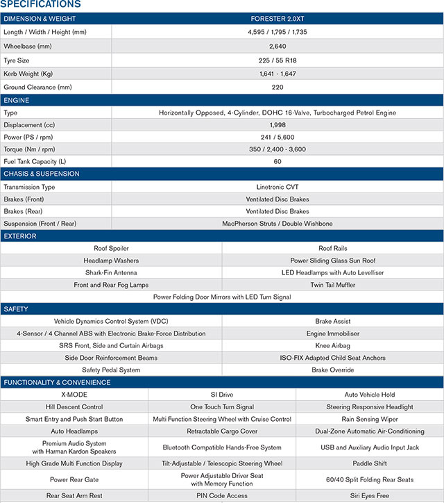 ส่วนรุ่น 2.0XT มาพร้อมเครื่องยนต์ Boxer Direct-Injection Turbo 241 แรงม้า (PS) ที่ 5,600 รอบต่อนาที อัตราการใช้เชื้อเพลิงอย่างมีประสิทธิภาพที่ระดับ 8.5 ลิตร ต่อ 100 กิโลเมตร