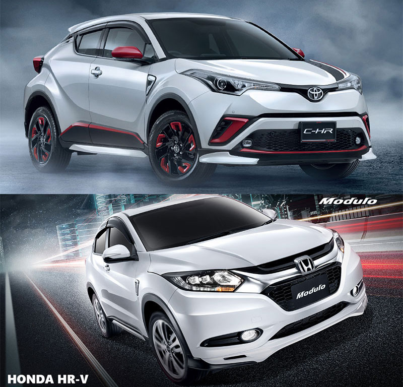 เชื่อว่านาทีนี้ใครที่กำลังสนใจรถครอสโอเวอร์ขนาดเล็กดีไซน์เก๋สำหรับคนรุ่นใหม่ไว้ใช้งานหรือแฮงก์เอาท์ในเมือง หรือทำกิจกรรมนอกเมืองบ้างในช่วงวันหยุดสุดสัปดาห์ น่าจะต้องมี Toyota C-HR 2018 กับ Honda HR-V 2017 อยู่ในตัวเลือกลำดับต้น ๆ และนี่จะเป็นการนำเอาสองคู่หูดูโอ้ระดับ Mainstream มาเปรียบเทียบสเปค ด้วยเงื่อนไขเพียง "ต้องเป็นตัวท็อปสุด" ให้เห็นกันว่าเงินที่ต้องจ่าย (ซึ่งไม่เท่ากัน) เพื่อแลกกับรถสองรุ่นนี้มาขับเก๋ ๆ เราจะได้อะไรกลับมาบ้างและมีความแตกต่างกันอย่างไร...เริ่ม !