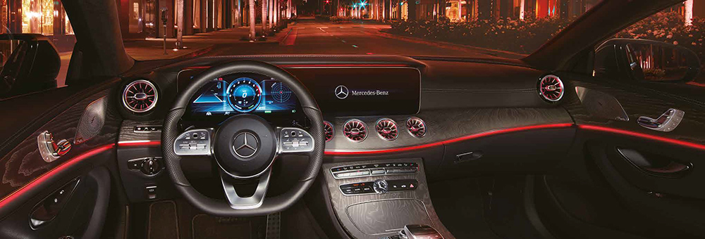 กาบบันไดเรืองแสงพร้อมสัญลักษณ์ Mercedes-Benz, ชุดคันเร่งและแป้นเบรกแบบสปอร์ต อีกทั้งยังสามารถเลือกสีของไฟเรืองแสงล้อมรอบห้องโดยสารได้ถึง 64 สี (Premium ambient lighting)