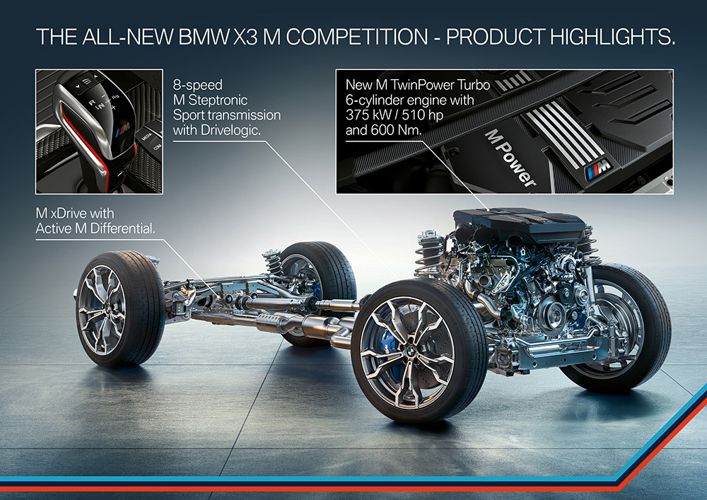 โดย All-new BMW X3 M และ All-new BNW X4 M จะใช้เครื่องยนต์เบนซิน ระดับความโหด 2 เวอร์ชั่น คือแบบ 6 สูบเรียง ขนาด 3.0 ลิตร M TwinPower Turbo ให้กำลังสูงสุด 480 แรงม้า แรงบิดสูงสุด 600 นิวตันเมตร และแบบ Bi-Turbo ที่ช่วยชูกำลังได้อีก 30 แรงม้า เป็น 510 แรงม้า ใน X3 M และ X4 M ที่มีคำว่า Competition ต่อท้าย ซึ่งทั้งหมดจะจับคู่กับเกียร์ 8 สปีด M Steptronic ก่อนปล่อยพลังลงพื้นถนนผ่านล้อทั้ง 4 ด้วยระบบขับเคลื่อน M xDrive