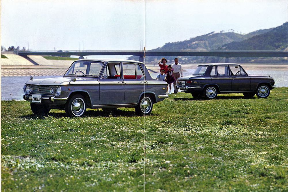 สำหรับดีไซน์ของ Mazda Familia เจเนอเรชั่นแรก ออกแบบโดยนักออกแบบชื่อดัง Giorgetto Giugiaro ครั้งยังอยู่ในสำนัก Bertone ใช้เครื่องยนต์ขนาดเล็กแค่ 800 ซี.ซี. และค่อยขยับเป็น 1,000 ซี.ซี. ดังนั้นสไตลิ่งของ Mazda Familia จึงพูดได้ว่าไม่ธรรมดาและมีความเป็นอิตาเลียนพอตัว แม้การเดินสันครีบรอบคันจะตามรถอเมริกันอย่าง Chevrolet Corvair (แต่จะว่าไปสันครีบน้อย ๆ นี้ปรากฏในรถ Concept ของอิตาลีมาก่อนแล้ว) อันลดรูปมาจากยุค Jet Edge ที่คลั่งครีบหางและองค์ประกอบต่าง ๆ เลียนแบบเครื่องบินซึ่งเทรนด์นี้แพร่ระบาดไปทั่วโลก (ส่วนหนึ่งก็เพื่อเอาใจตลาดอเมริกันด้วย)