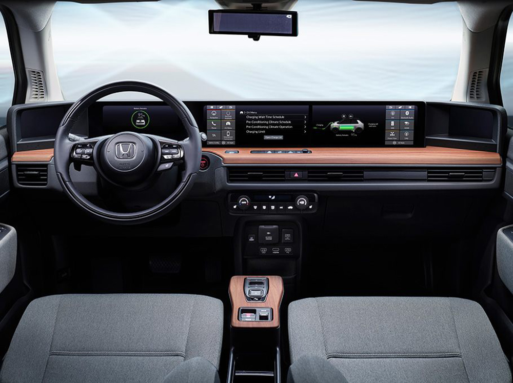 ส่วนภายในของ Honda e ปล่อยภาพแผงคอนโซลของคัน Prototype ที่ชัดขึ้นมาให้ชมอีกหนึ่งภาพ เป็นแนว Contemporary ที่มินิมอล เต็มไปด้วยจอแสดงผลวางเรียงต่อกันในแนวนอน มุมสุดเป็นจอแสดงภาพจากกล้องแทนกระจกมองข้าง พื้นรถเป็นแบบ Flat Floor แม้ในภาพคัน Prototype จะมีคอนโซลกลาง แต่ Honda ระบุว่าผู้โดยสารตอนหน้าสามารถเดินทะลุไปยังเบาะหลังได้