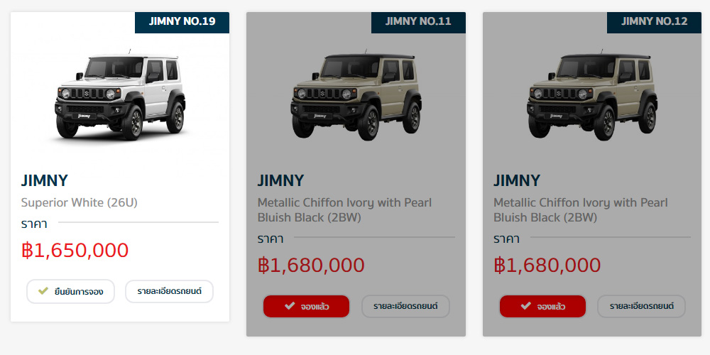 โดยเป็น Suzuki Jimny ลำดับที่ 19 สีขาว Superior White เกียร์อัตโนมัติ ราคา 1,650,000 บาท กำหนดส่งมอบเดือนสิงหาคม 2562 ส่วนที่เหลือถูกจับจองไปหมดแล้ว จริงอยู่ใคร ๆ ก็สามารถลงชื่อจองได้ แต่จะเสร็จสมบูรณ์ก็ต้องชำระเงินมัดจำการจอง 50,000 บาท ล่วงหน้าด้วยบัตรเครดิตอยู่ดี หมายความว่าถ้ายกเลิกอาจต้องสูญเงินจำนวนดังกล่าว ซึ่งเป็นจำนวนเงินที่ไม่น้อย ดังนั้นยอดจองที่แสดงกับยอดขายจริงที่สุดอาจไม่แตกต่างกันมากนัก