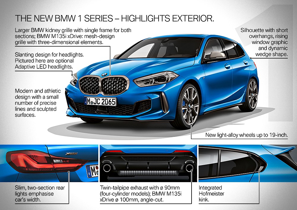 All-new BMW 1 Series 2020 กับมิติใหม่แห่งความสปอร์ต ผ่านภาษาการออกแบบที่กร้าวขึ้น ทั้งจากจมูกฉลามแปะกระจังหน้าขนาดใหญ่ ไฟหน้าดุและเส้นสายชัดเจนขึ้นบนสถาปัตยกรรมโครงสร้าง "ขับเคลื่อนล้อหน้า" ของ BMW ซึ่งเคลมว่ายังคงบุคลิกการขับขี่ตามแบบฉบับของ BMW แต่ได้พื้นที่ใช้สอยภายในเพิ่มจากโฉมปัจจุบันที่ขับเคลื่อนล้อหลัง
