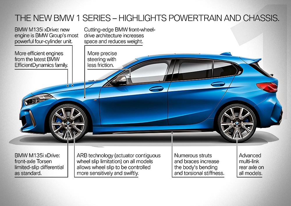 โดย All-new BMW 1 Series 2020 จะมีความยาว 4,319 มม. (ลดลง 5 มม.) กว้าง 1,799 มม. (เพิ่ม 34 มม.) สูง 1,434 มม. (เพิ่ม 13 มม.) และความยาวฐานล้อ 2,670 มม. (ลดลง 20 มม.) เมื่อเทียบกับ BMW 1 Series โฉมปัจจุบัน