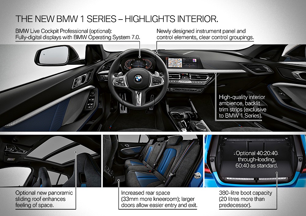 แต่ถึงบางมิติจะลดทอนลง All-new BMW 1 Series 2020 กลับมีเนื้อที่ภายในใหญ่ขึ้น (สมาร์ตน้อยลง ด้วยโอเวอร์แฮงก์หน้ายาวขึ้น) โดยเฉพาะสำหรับผู้โดยสารตอนหลัง ทั้งพื้นที่วางขา ช่วงเอวและเหนือศีรษะ จากการ Cab forward ห้องโดยสาร ทำให้ผู้ขับขี่และผู้โดยสารตอนหน้าขยับขึ้นหน้าไป 42 มม. เป็นผลมาจากการเปลี่ยนระบบขับเคลื่อนที่มีทั้งข้อดีและข้อเสีย ขณะที่ดีไซน์ภายในทันสมัยขึ้น แต่ยังคงให้อารมณ์เดิม ๆ