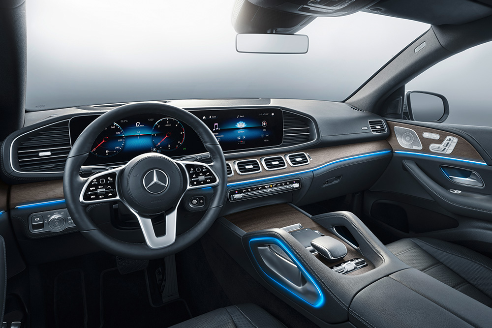 บรรยากาศของ All-new Mercedes-Benz GLE Coupe 2020 จึงเหมือนนั่งในห้องบัญชาการ การจัดวางโปร่งโล่ง (แต่คับแคบกว่า Mercedes-Benz GLE 2020 เพราะแนวหลังคาและฐานล้อสั้นลง 60 มม.) อวกาศและล้ำสมัย ด้วยแผงมาตรวัดสี่เหลี่ยมผืนผ้าขนาดใหญ่ ประกอบด้วยจอ 12.3 นิ้ว 2 จอ รวมถึงคอนโซลกลางที่ค่อนข้างหวือหวา คาดเส้นไฟ Ambient Light ที่เลือกเฉดได้เกินครึ่งร้อย พร้อมระบบผู้ช่วย MBUX เวอร์ชั่นล่าสุดคอยรับคำสั่ง ซึ่ง AI ใน MBUX นั้นฉลาดพอที่จะเข้าใจสำนวนการพูดคุยปกติ