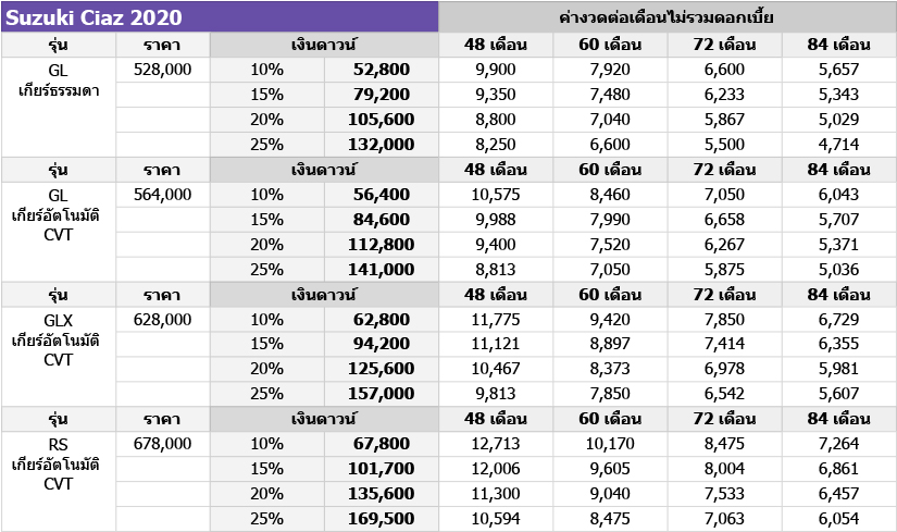 Suzuki Ciaz 2020 ตารางผ่อน-ดาวน์