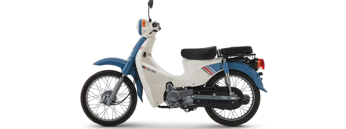 Solar Groove 2023 รถมอเตอร์ไซค์ครอบครัวดีไซน์คลาสสิก เครื่องยนต์ 125 ซี.ซี. จ่ายเชื้อเพลิงด้วยคาบูเรเตอร์ เกียร์วน 4 สปีด มีให้เลือก 4 สี ราคา 38,900 บาท