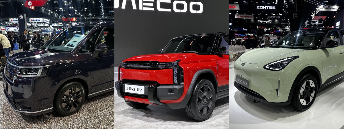 Mazda 6e สปอร์ตซีดานไฟฟ้าจากค่าย Zoom-Zoom แม้ใช้พื้นฐานร่วมกับ Deepal เครือ Changan แต่ภายนอกยังมีความเป็น Mazda ทั้งการเล่นพื้นผิวตัวถังและเอกลักษณ์ด้านหน้าที่เป็นซิกเนเจอร์เฉพาะตัว และภายในตกแต่งได้พรีเมียมตามคาดด้วยใช้หนัง Nappa สลับกับวัสดุสังเคราะห์ Suede คล้ายหนังกลับหนานุ่มฟูในรุ่นภายในสีน้ำตาล (Tan) สเปกสมรรถนะเบื้องต้น 258 แรงม้า เร่งจาก 0-100 กิโลเมตร/ชั่วโมง ใน 8 วินาที และแชสซีส์มีความสมดุลด้วยน้ำหนักบนเพลาหน้า-หลัง เกือบจะ 50:50 พร้อมรับเปิดจองในงานกับราคาคาดการณ์ 1,XXX,000 บาท ซึ่ง X แรกที่แทนหลัก 1-9 นั้น คาดเดาได้ยากและอาจชี้เป็นชี้ตายยอดขายได้เลย